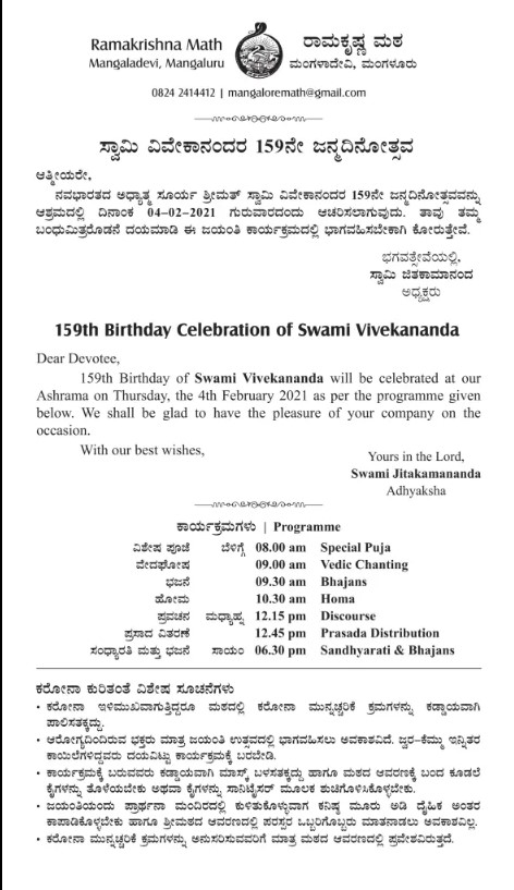 The 159th Birthday of Swami Vivekananda will be observed in our Ramakrishna Math, Mangalore on Thursday, the 4th February 2021 as per the programme details given below. Please stick to the Covid-19 prevention guidelines provided.