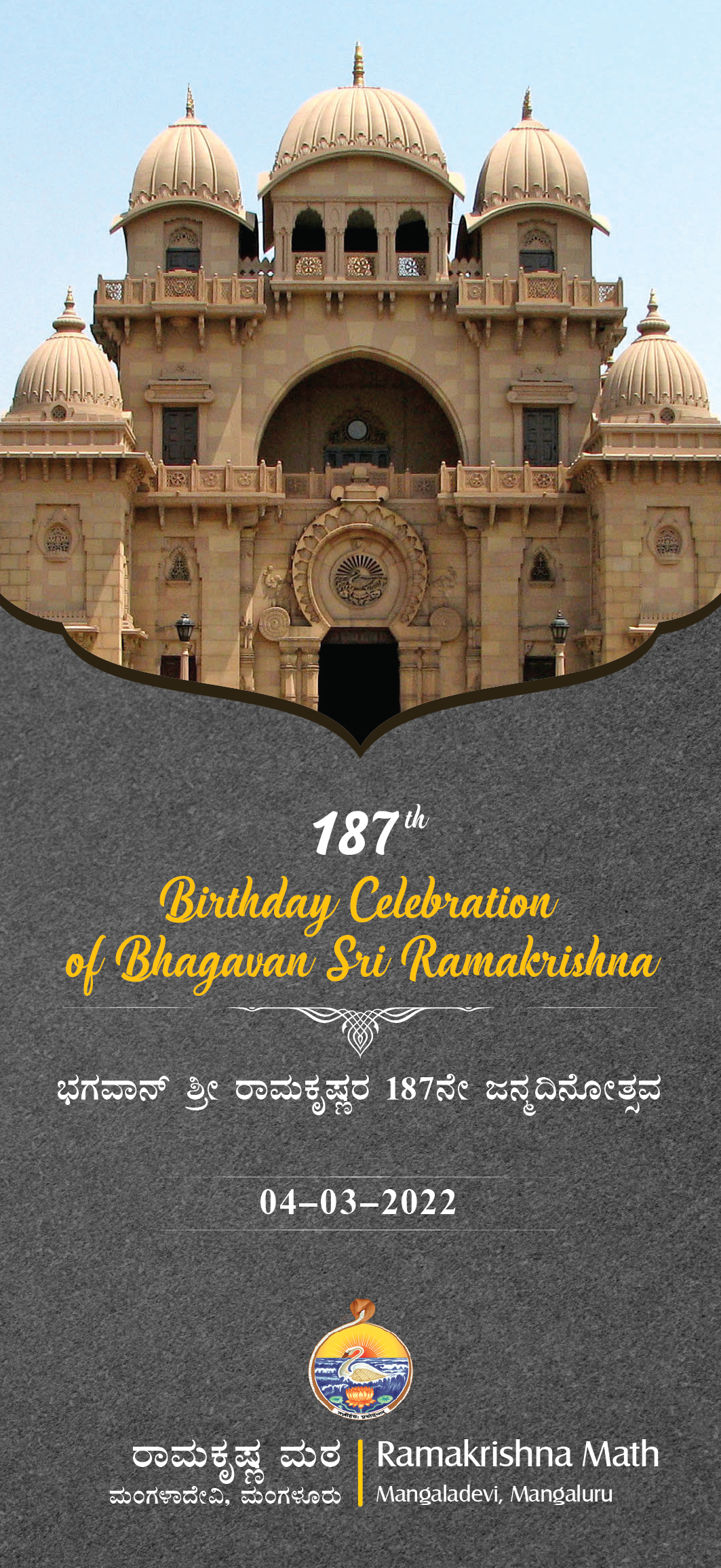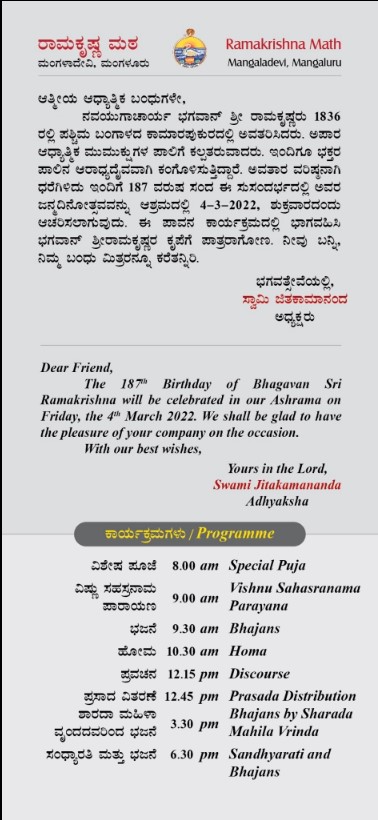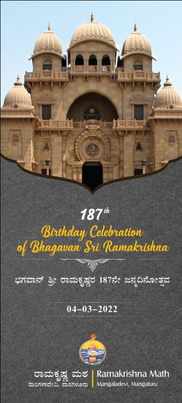 We shall be observing the 187th Birthday of Bhagavan Sri Ramakrishna at Ramakrishna Math, Mangalore on Friday, 4th March 2022 as per the programme given below. We invite all our devotees, well wishers & friends to attend the programme.
