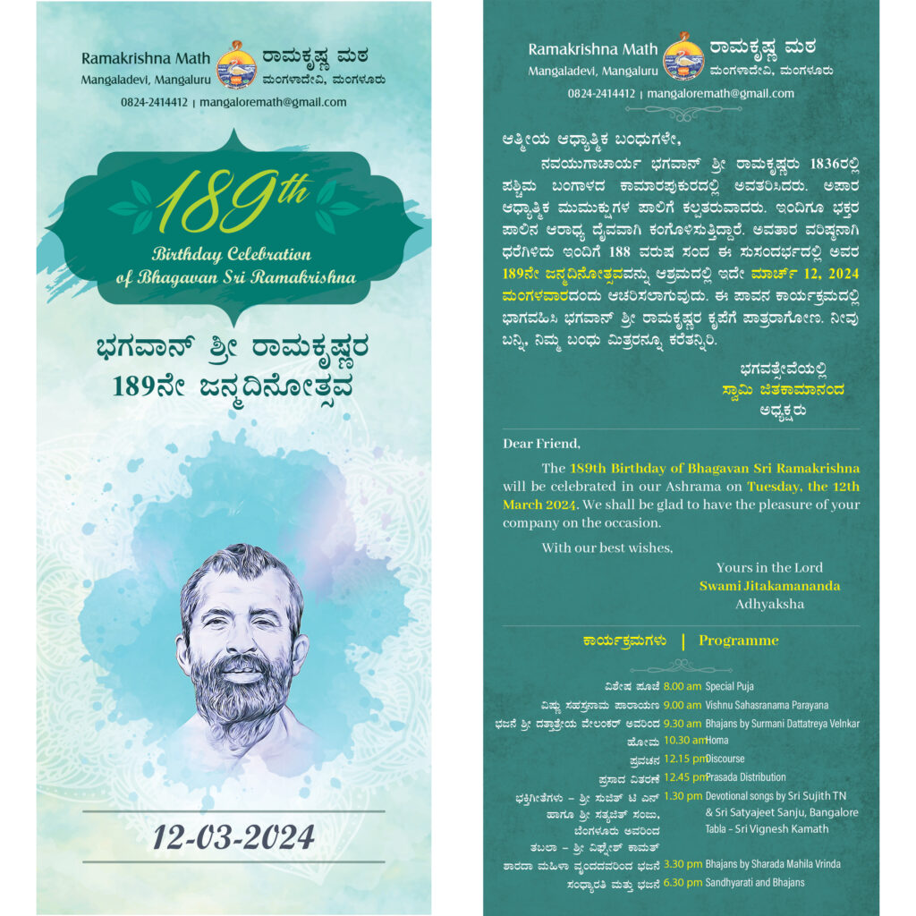 The 189th Birthday Celebration of Bhagavan Sri Ramakrishna will be observed at Ramakrishna Math, Mangalore on Tuesday, the 12th March 2024 as per the programme given below. We invite all our friends, devotees & well wishers to attend the programme.