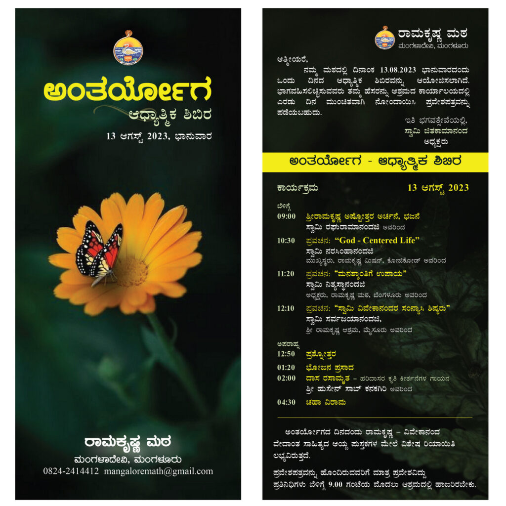Ramakrishna Math, Mangaluru is organizing “Antaryoga – Spiritual Retreat” in Ashrama on Sunday, the 13th August 2023Swami Narasimhanandaji, Head, Ramakrishna Mission , Kozhikode, will be delivering discourse in English on the topic, “God – Centered Life”. Swami Nityasthanandaji, Adhyaksha, Ramakrishna Math, Bangalore will be speaking in Kannada on the topic, “Manasshantige Upaya”. Swami Sarvajayanandaji, Ramakrishna Ashrama, Mysuru will be speaking on the topic, “Swami Vivekanandara Sanyasi Shishyaru”  In the afternoon, there will be devotional songs by Hussain Sab Kanakagiri, Bengaluru from 2 to 4.30 pm. Entry is free but through prior registration.