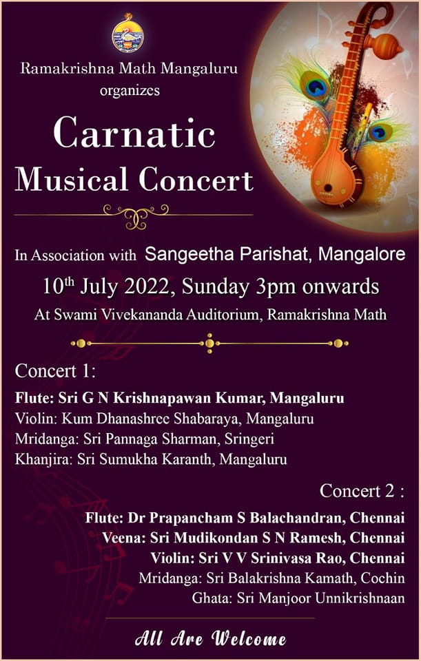 Ramakrishna Math, Mangaluru is organizing Carnatic Classical Music in association with Sangeetha Parishat, Mangalore on Sunday, the 10th July 2022 from 3 pm onwards. Details of the programme are given below. We invite all the music lovers to attend the programme.