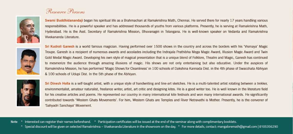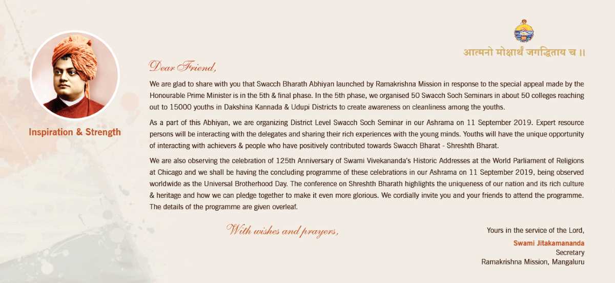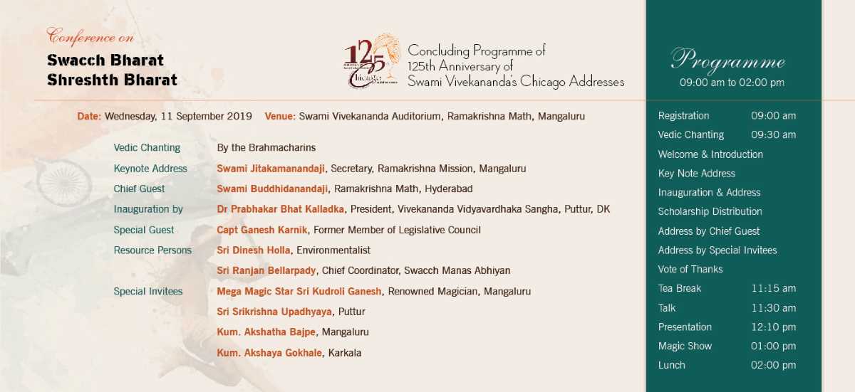 As a part of the ongoing Swacch Bharath Abhiyan taken up by Ramakrishna Mission, Mangaluru, we are organizing a District Level Conference on “Swacch Bharat Shreshth Bharat” in our Ashrama auditorium on 11th September 2019.