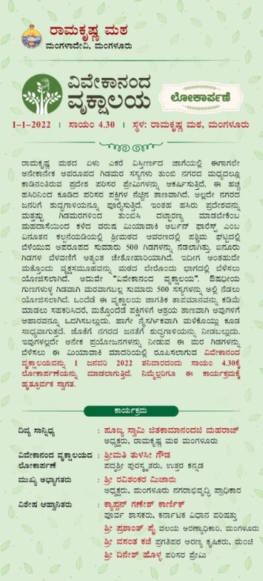 We shall be dedicating “Vivekananda Vriskhalaya“, a second urban Miyawaki forest in our Ashrama on Saturday, the 1st January 2022 at 4.30 pm as per the programme given below. Padmashri Tulasi Gowda will be dedicating on behalf of Ashrama.