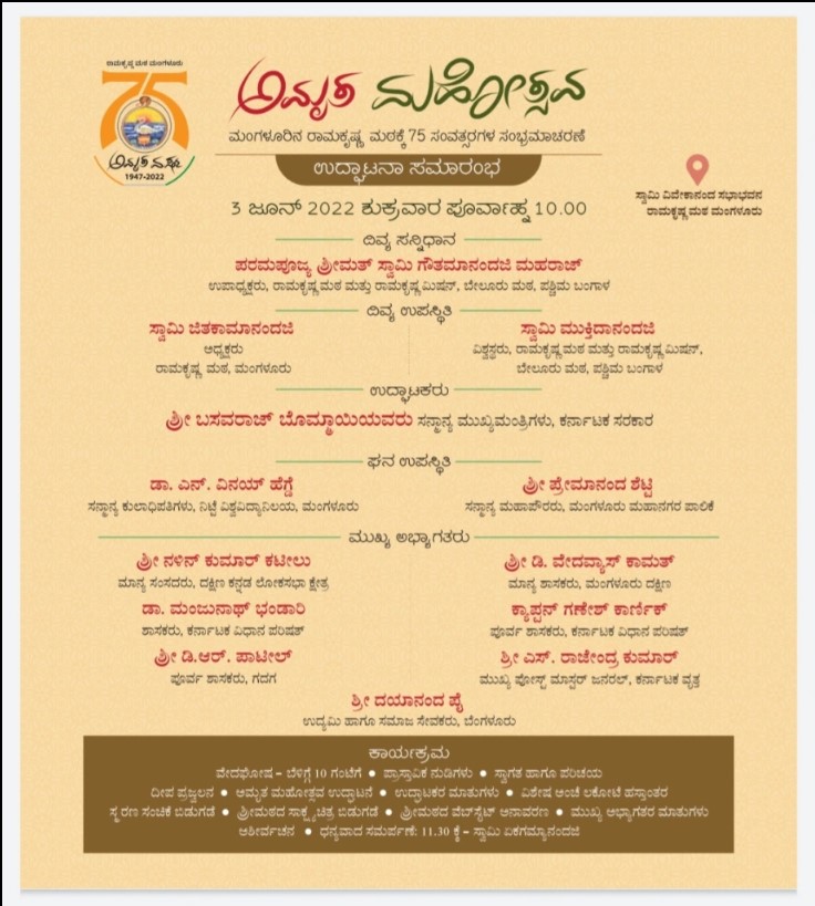 Ramakrishna Math, Mangalore is observing Amrita Mahotsava on the 3rd June 2022Srimat Swami Gautamanandaji Maharaj, Vice President, Ramakrishna Math & Ramakrishna Mission, Belur Math will be presiding over the ceremony. Sri Basavarj Bommai, Hon Chief Minister of Karnataka will be inaugurating the event. Dr N Vinay Hegde, Hon Chancellor, Nitte University, Sri Premananda Shetty, Hon Mayor of Mangalore City Corporation will be cheif guests. Sri Nalin Kumar Katee, MP, Sri Vedavyas Kamath, MLA, Dr Manjunath Bhandary, Captain Ganesh Karnik, Sri D R Patil, S Rajendra Kumar (Post Master General, Karnataka) and Sri Dayananda Pai (Industrialist) will be special invitees.
