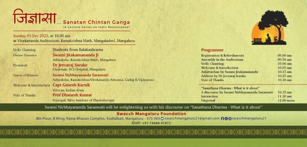 Inspired & guided by Ramakrishna Math, Mangaluru, Swacch Mangaluru Foundation Will be organizing a bi-monthly lecture series on a Sunday of alternate months on various relevant issues by renowned speakers under the banner “Jijnasa – Sanatan Chintan Ganga“, A lecture series on Indic Renaissance.