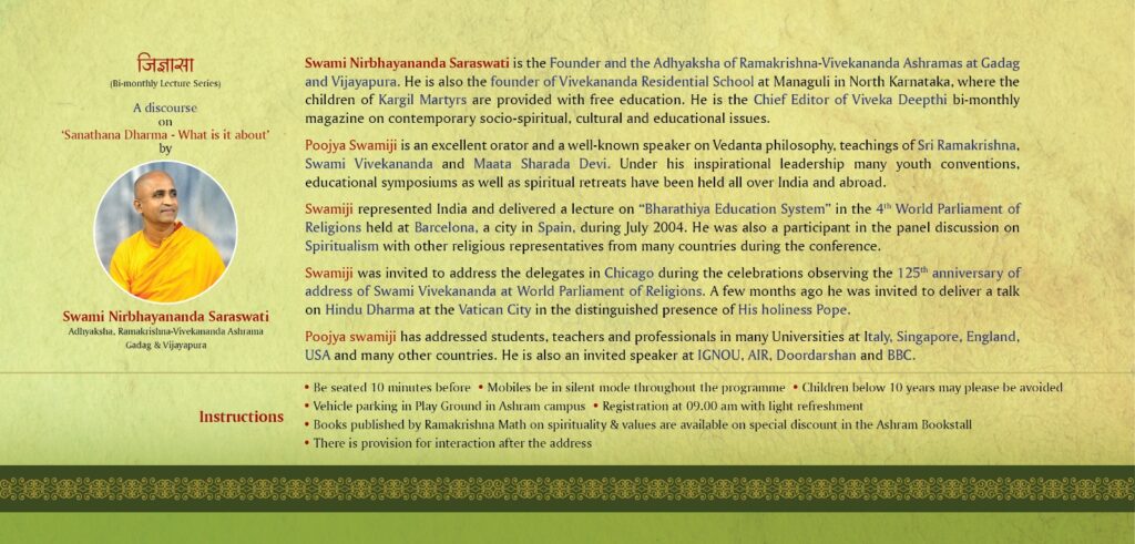 This will be followed by Talk and interaction by Swami Nirbhayananda Saraswati, President, Ramakrishna Vivekananda Ashrama, Gadag & Vijayapura on the topic, “Sanatana Dharma – What it is about“. Details of the programme are given below. We invite our devotees, friends & well-wishers to attend the Lecture.