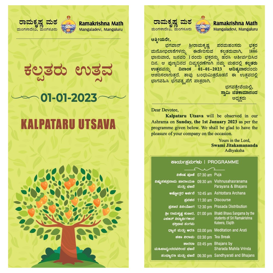 We shall be observing Kalpataru Utsav at Ramakrishna Math, Mangalore on Sunday, 1st January 2023 as per the programme given below. We invite all our devotees and well-wishers to attend the programme.