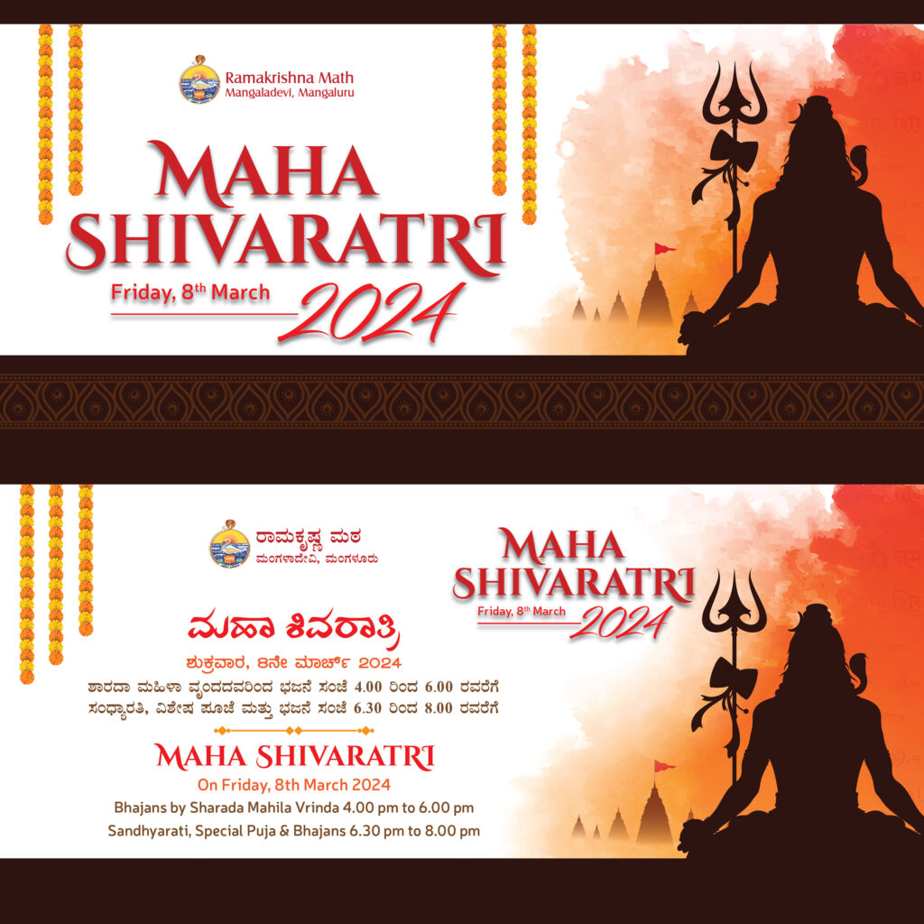 We shall be observing Maha Shivaratri at Ramakrishna Math, Mangalore on Friday, the 8th March 2024 as per the programme given below. We invite all our devotees, friends & well-wishers to attend the programme.