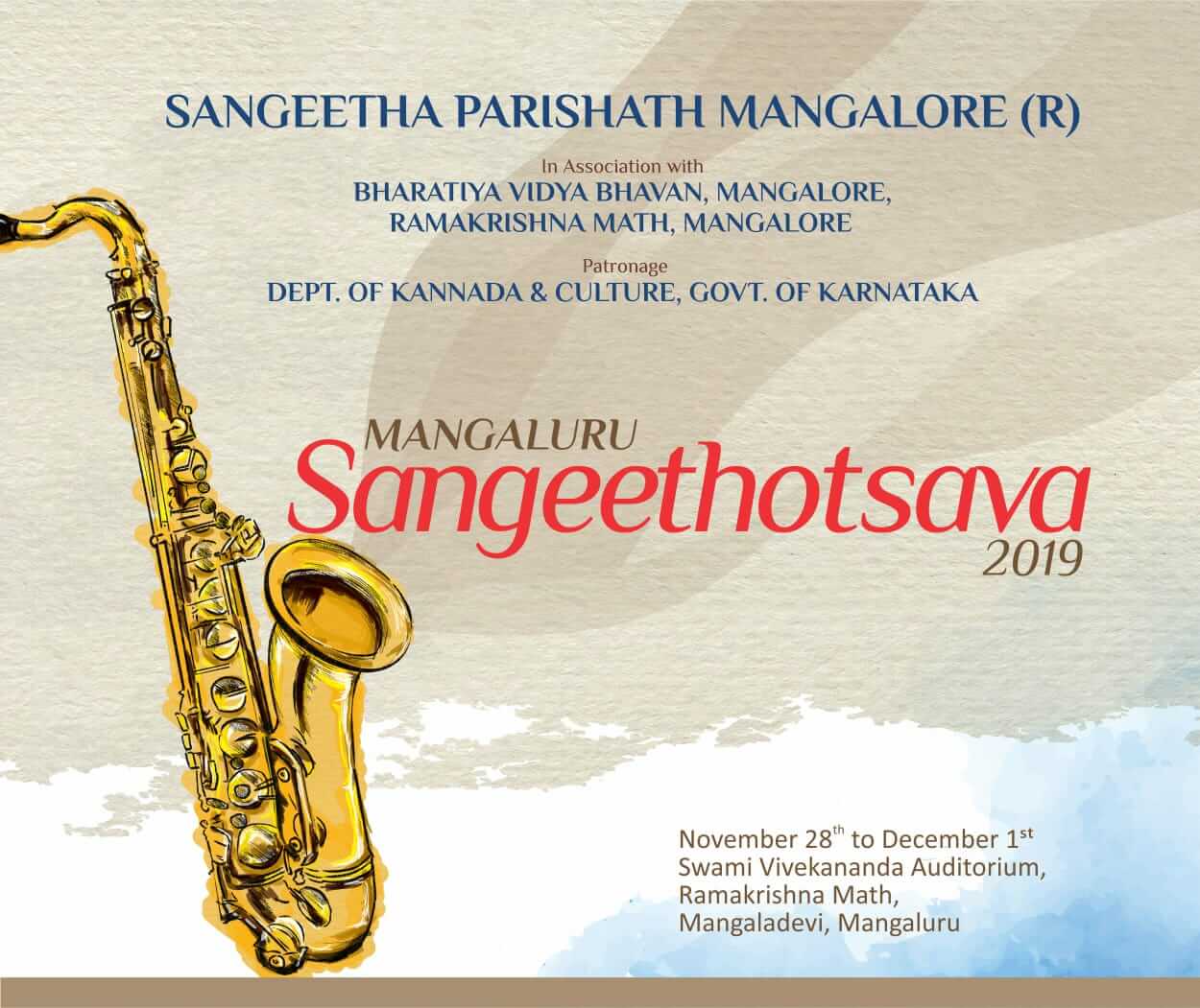 Ramakrishna Math, Mangaluru in association with Sangeetha Parishat, Mangalore, Bharatiya Vidya Bhavan, Mangalore & Dept of Kannada & Culture, Govt. of Karnataka is organizing Mangaluru Sangeethotsava from 28th November to 1st December.