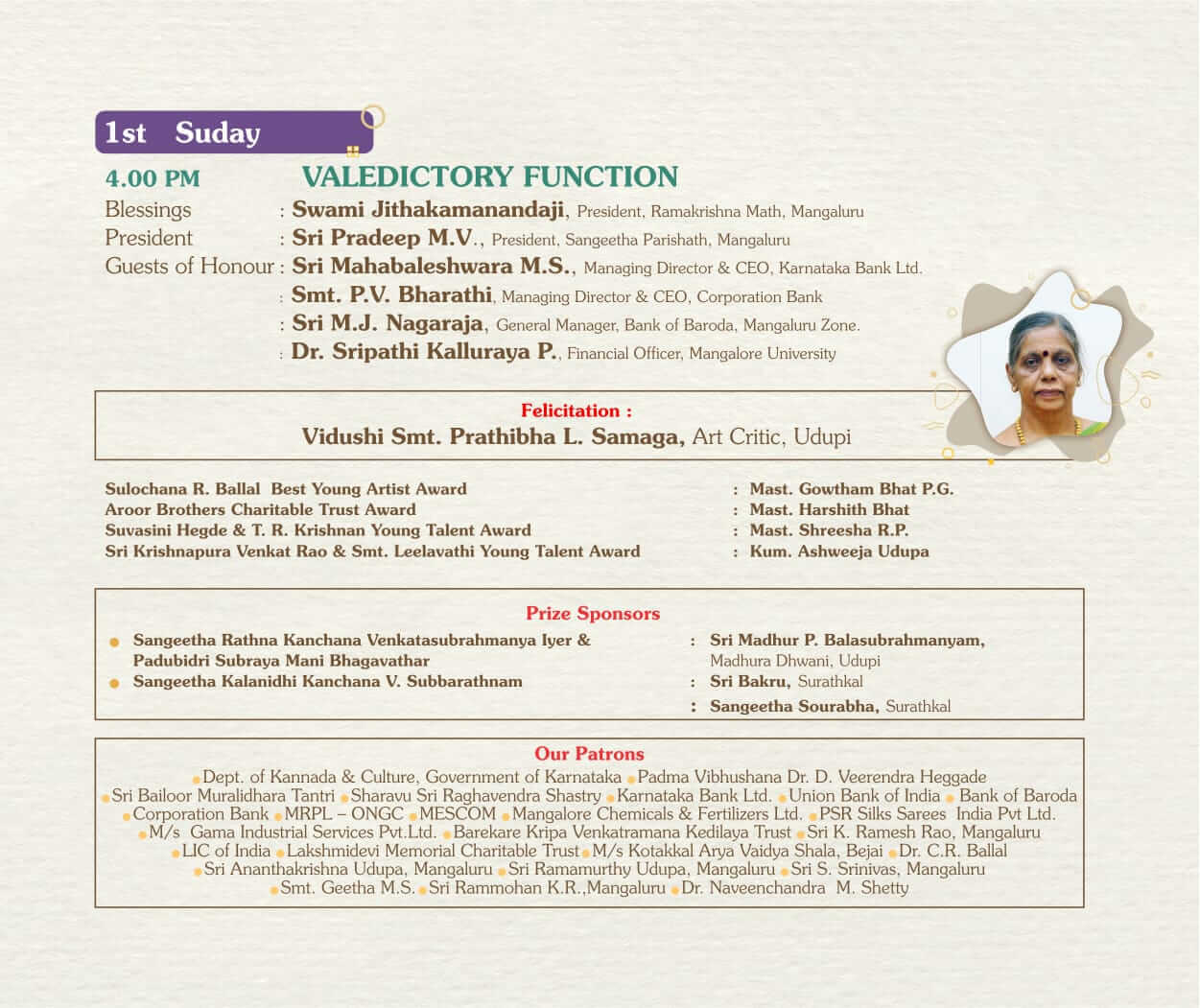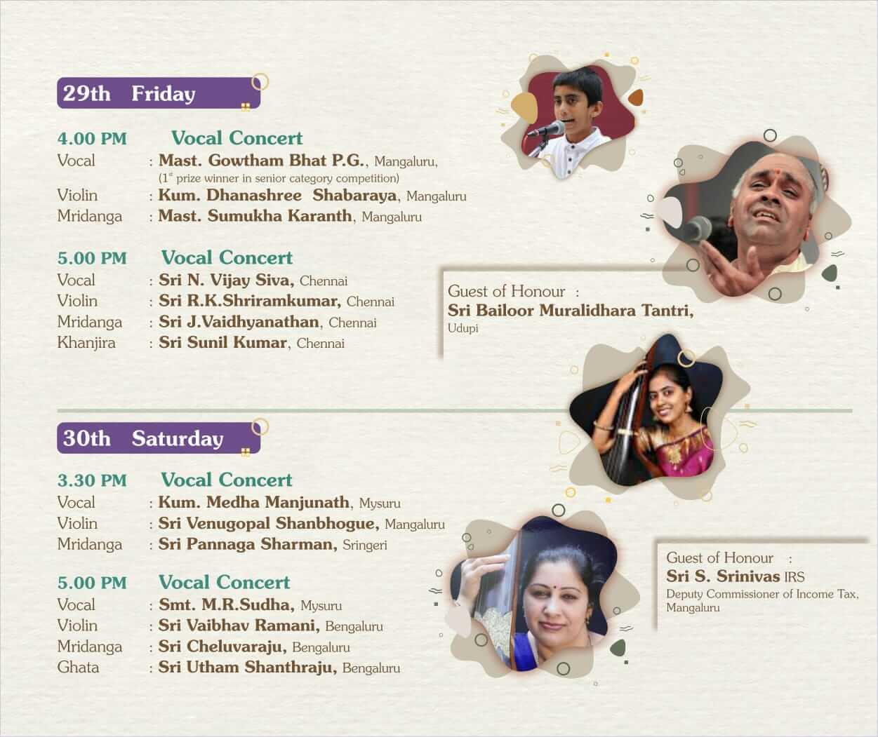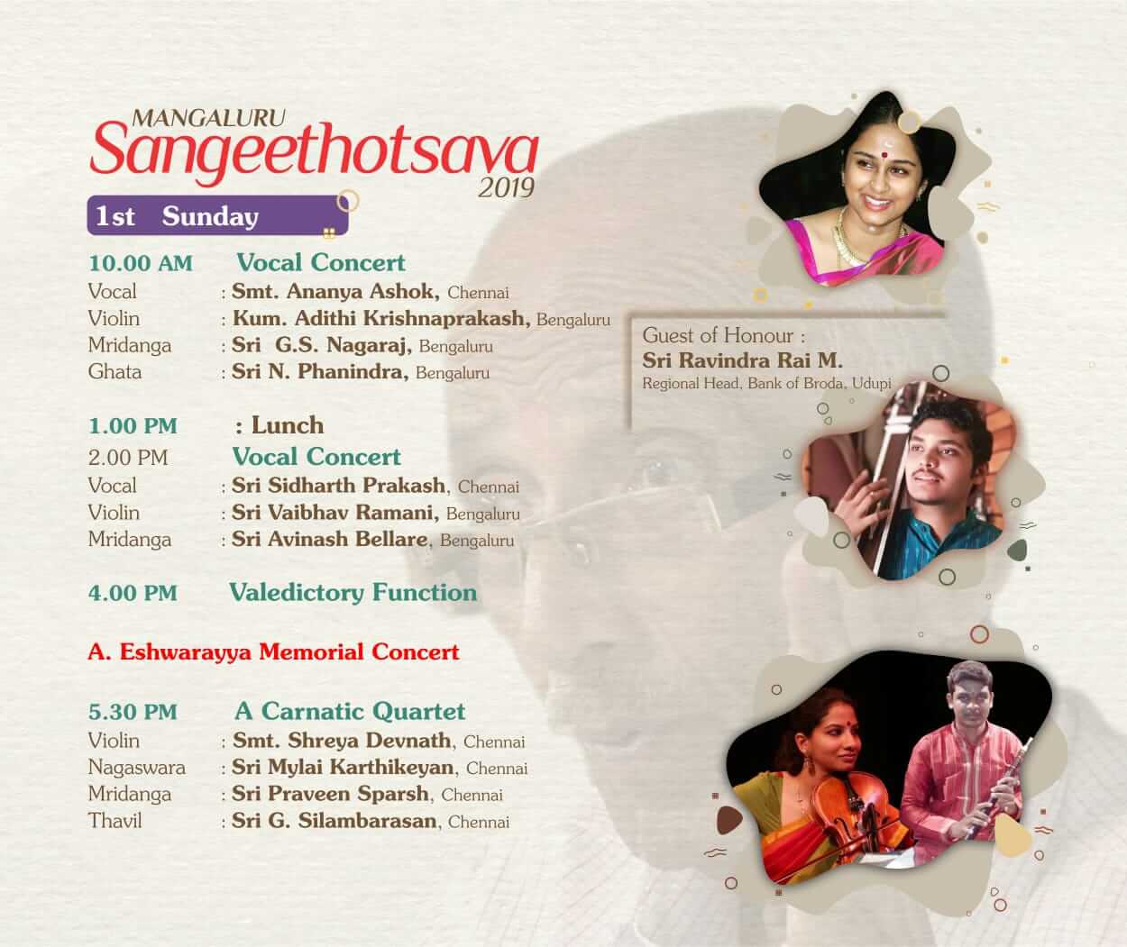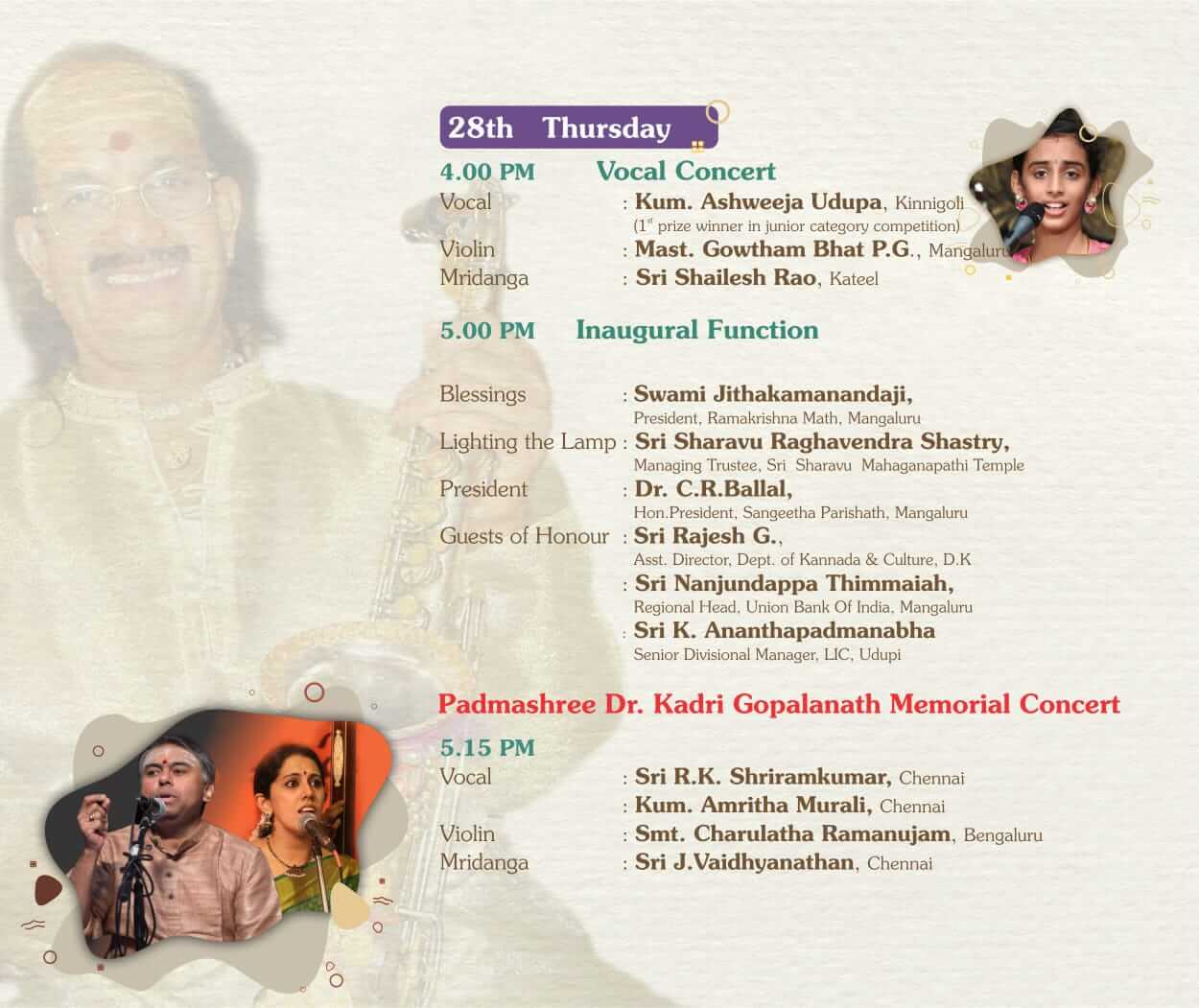 We invite all our friends, well-wishers and music lovers to attend the programme and enjoy the renditions. Details of the programme are given below: