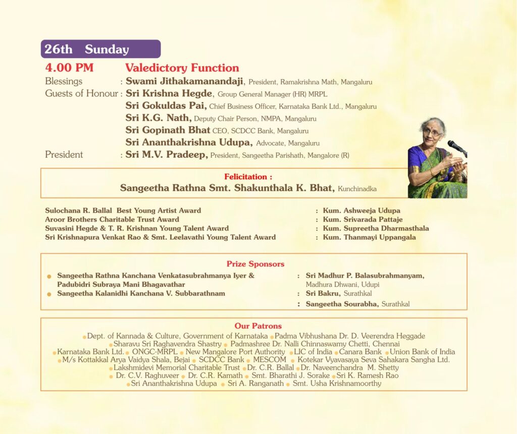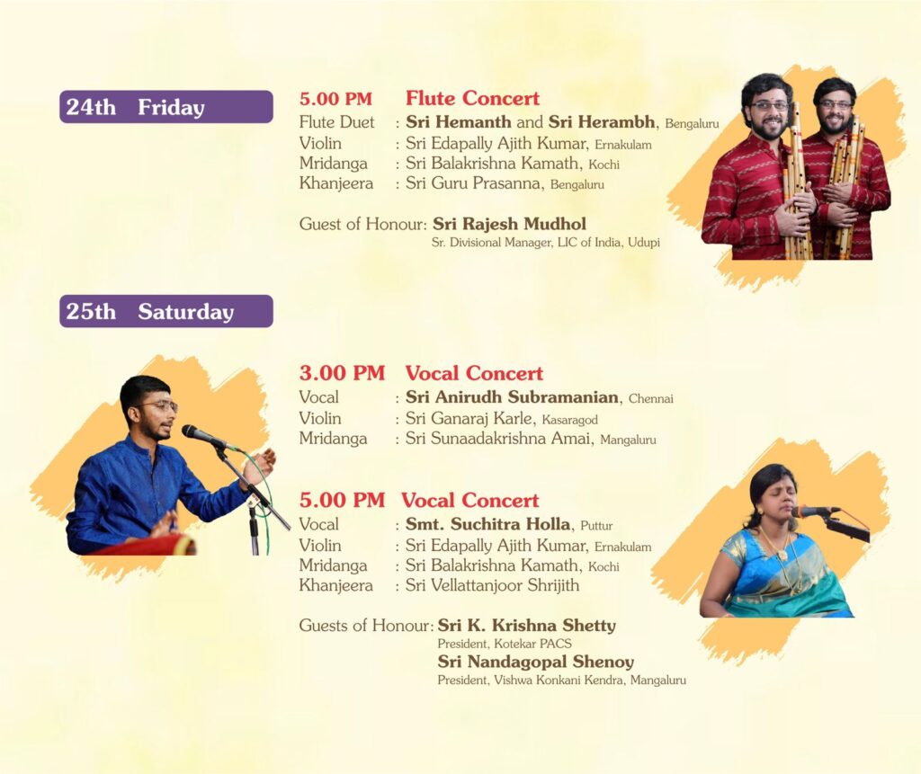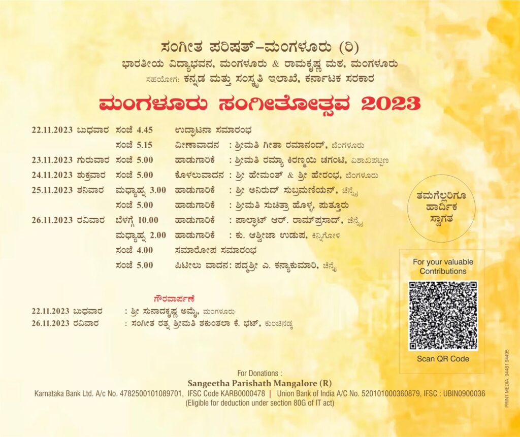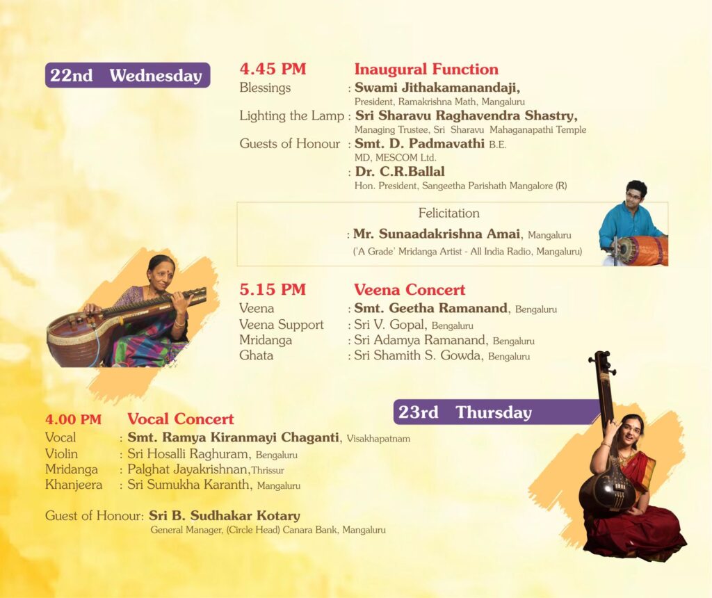 Ramakrishna Math, Mangaluru in association with Sangeetha Parishat Mangalore & Bharatiya Vidya Bhavan, Mangalore is organizing Mangaluru Sangeethotsava 2023 from 22nd to 26th November 2023 at Swami Vivekananda Auditorium. Details of the programme are given in the following pages. We invite all the interested to attend the programme & enjoy the renditions.