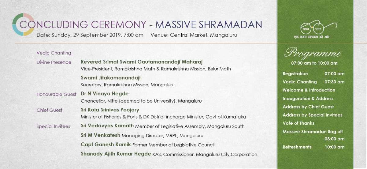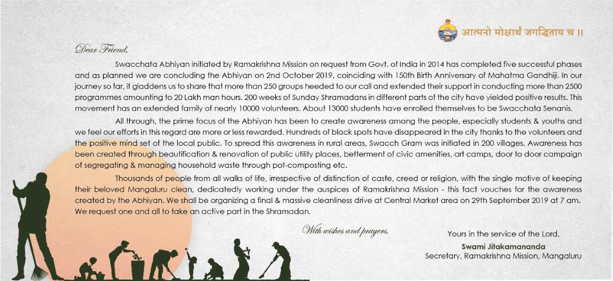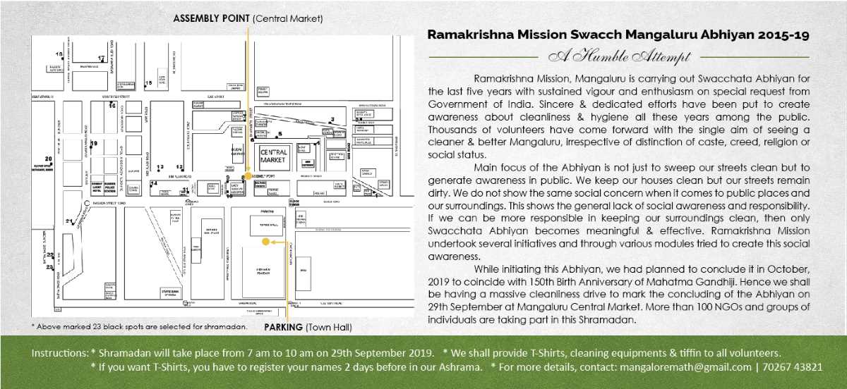 We shall be organizing a final & massive cleanliness drive at Central Market area on 29th September 2019 at 7.30 am. Sri Kota Srinivas Poojary, Dist. In charge Minister & Minister for Fisheries, Port & Muzarai, Govt. of Karnataka will be flagging off the massive Shramadan in the divine presence of Srimat Swami Gautamanandaji Maharaj, Vice President, Ramakrishna Math & Mission, Belur Math.