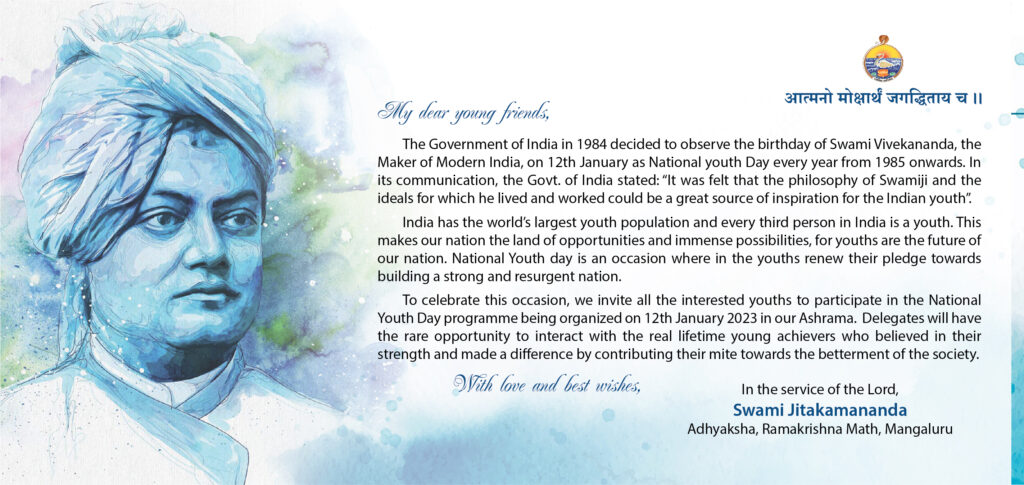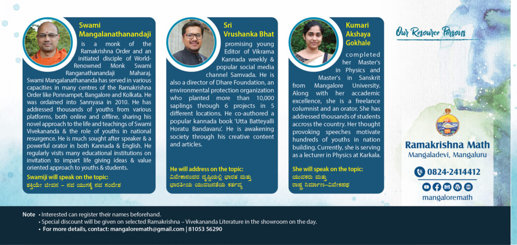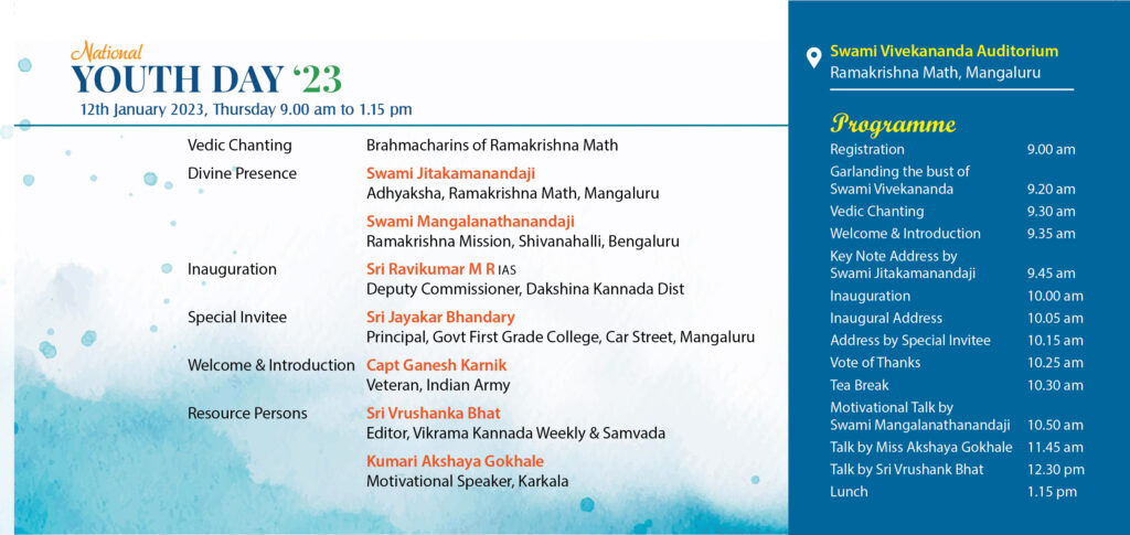 Ramakrishna Math, Mangalore will be observing National Youth Day on Thursday, the 12th January 2023 as per the programme given below. We invite all our young friends to attend the programme. Programme will be inaugurated by Sri Ravikumar M R, DC of Dakshina Kannada Dist. Swami Mangalanathanandaji of Ramakrishna Mission, Shivanahalli, Bangalore, Sri Vrushank Bhat, Editor of Vikrama weekly & Kumari Akshaya Gokhale, Lecturer, Karkala will be addressing & motivating the youths on different topics. Details of the programme are given below: