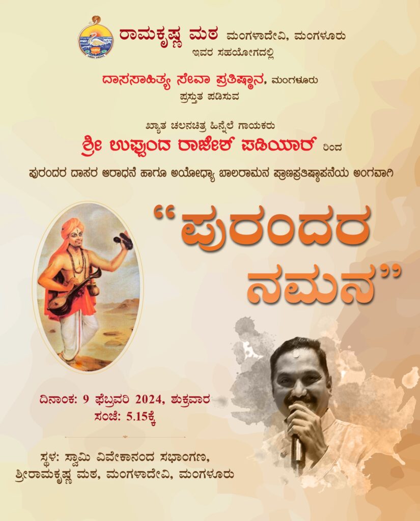Ramakrishna Math, Mangalore in association with Dasa Sahitya Seva Pratishthana, Mangalore is organizing “Purandara Namana“, special programme in Swami Vivekananda Auditorium on Friday, the 9th February 2024 from 5 pm to 7.30 pm on the Occasion of Sri Purandara Dasa Aradhana. Sri Uppunda Rajesh Padiyar will be rendering compositions of Sri Purandaradasa. We invite all our friends, devotees & well-wishers to attend the programme and enjoy the renditions.
