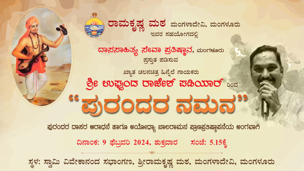 Ramakrishna Math, Mangalore in association with Dasa Sahitya Seva Pratishthana, Mangalore is organizing “Purandara Namana“, special programme in Swami Vivekananda Auditorium on Friday, the 9th February 2024 from 5 pm to 7.30 pm on the Occasion of Sri Purandara Dasa Aradhana. Sri Uppunda Rajesh Padiyar will be rendering compositions of Sri Purandaradasa. We invite all our friends, devotees & well-wishers to attend the programme and enjoy the renditions.