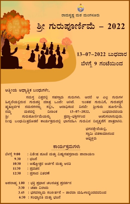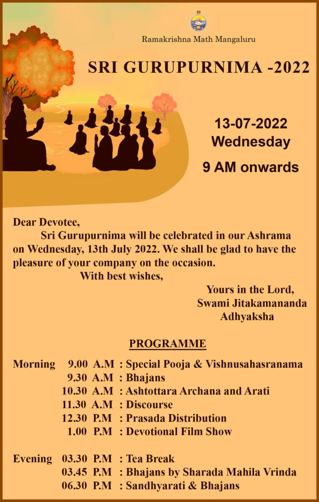 Sri Gurupurnima will be observed at Ramakrishna Math, Mangalore on Wednesday, the 13th July 2022 as per the programme given below. We invite you along with your family and friends to participate in the programme.