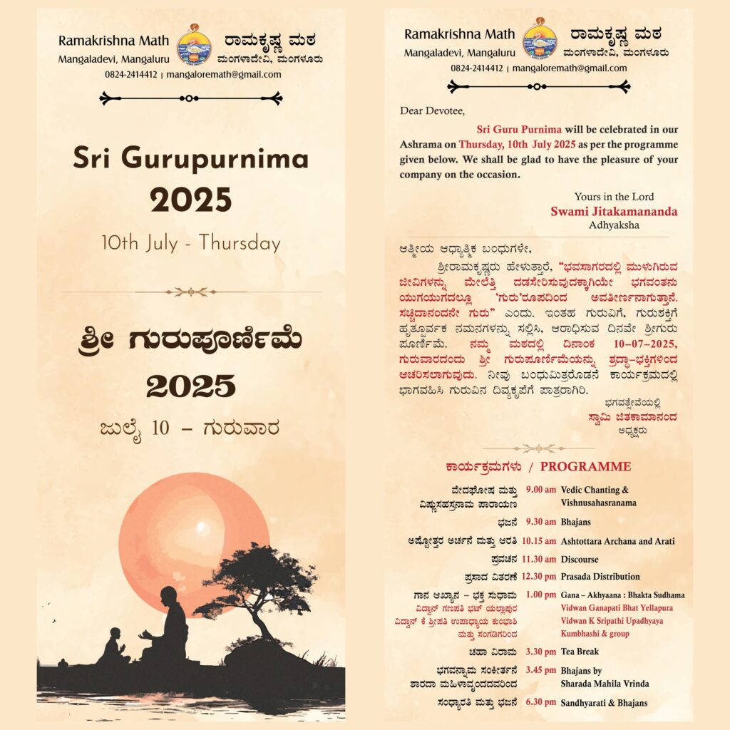 Sri Gurupurnima will be observed at Ramakrishna Math Mangalore on Thursday, the 10th July 2025 as per the programme given below. We invite all our devotees, friends & well-wishers to attend the programme.