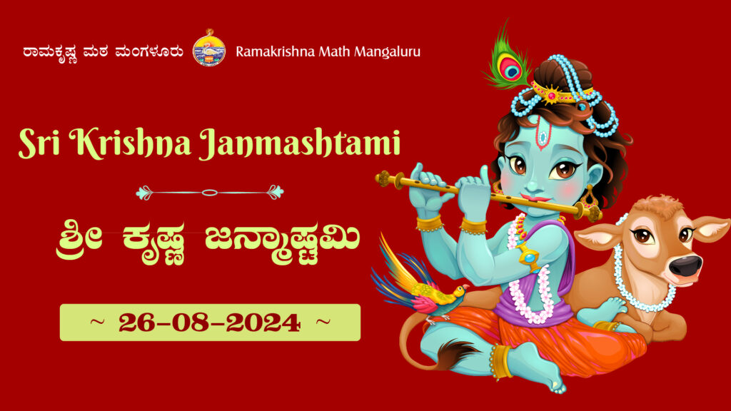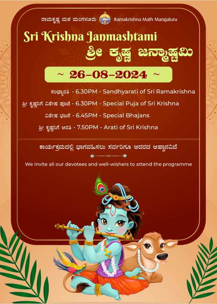 We shall be observing Sri Krishna Janmashtami at Ramakrishna Math, Mangaluru on Monday, the 26th August 2024 as per the programme given below. We invite all our devotees, friends & well-wishers to attend the programme: