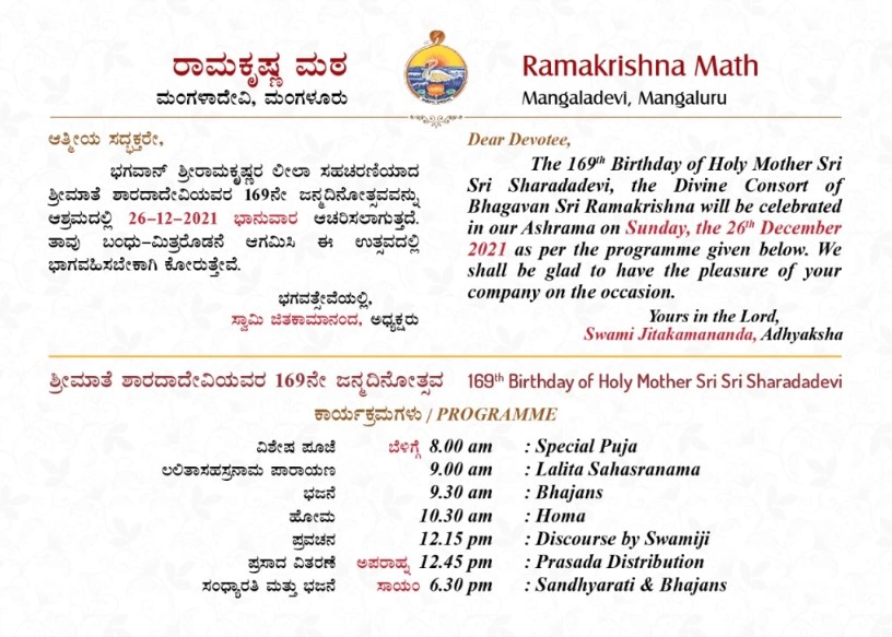 Ramakrishna Math, Mangaluru will be observing the 169th Birthday of Holy Mother Sri Sharadadevi on Sunday, the 26th December 2021 according the programme given below. We invite all our devotees, friends and well-wishers to attend the programme.
