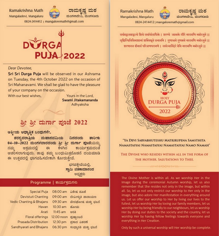 Sri Sri Durga Puja will be observed at Ramakrishna Math, Mangaluru on the day of Mahanavami, i.e. the 4th October 2022, Tuesday as per the programme given below. We invite all our friends, devotees & well wishers to attend the programme and partake the blessings of the Divine Mother.