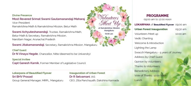 At 9.30 am by planting a sapling, Urban forest – Miyawaki forest work will be initiated, under Swacchata Abhiyan, in front of Mangalore Zilla Panchayat office at Urwa Stores in the divine presence of Srimat Swami Gautamanandaji Maharaj.
