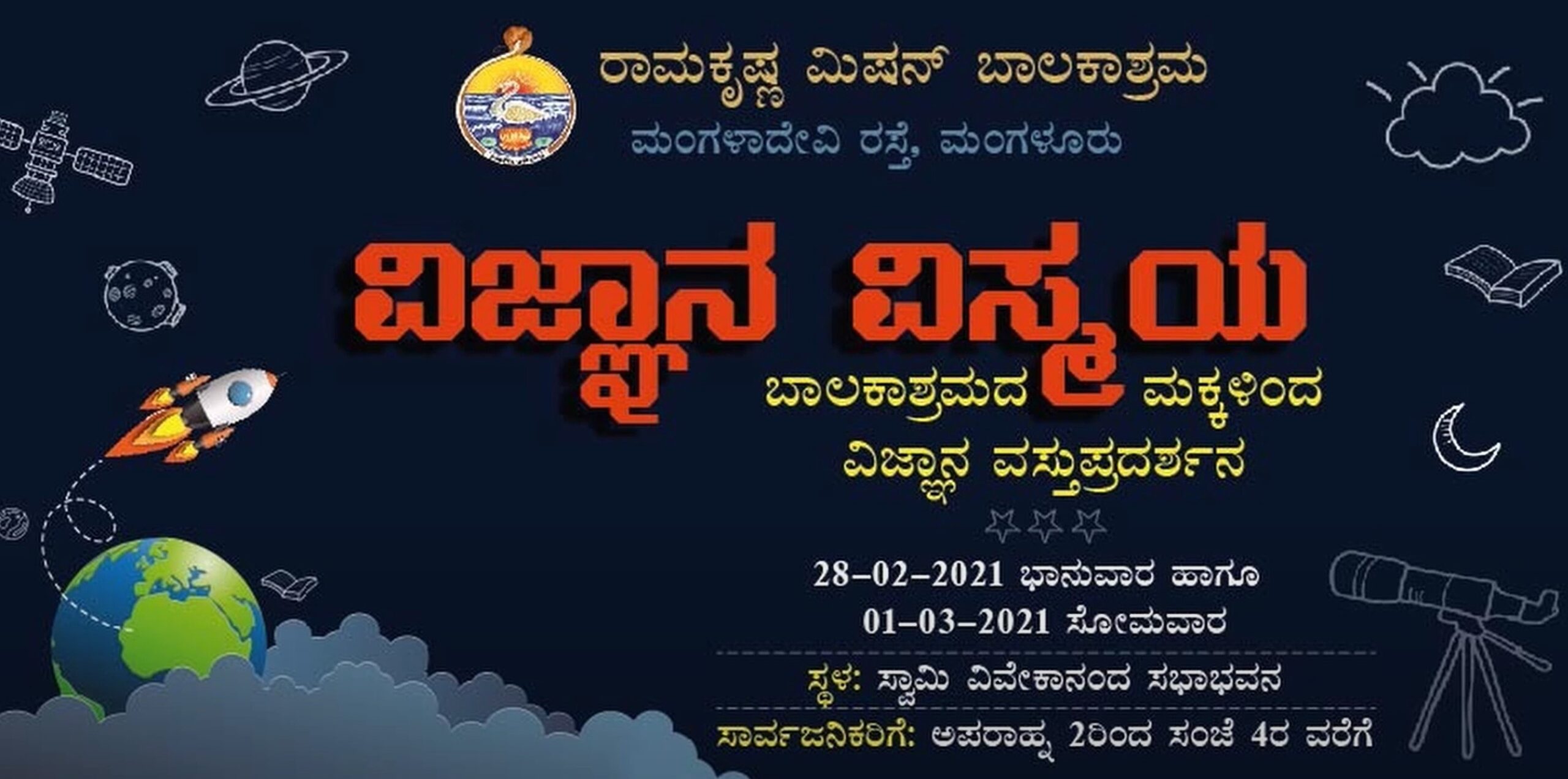 Celebration of National Science Day at Ramakrishna Mission Balakashrama, Mangaluru on 28 Feb 2021. This "Science Exhibition" was dedicated to Sir C V Raman and Swami Vivekananda. The exhibition was inaugurated by Srimat Swami Jitakamanandaji Mahara, Adhyaksha, Ramakrishna Math, Mangaluru. Sri Everest Srasta, Head Master, Cascia High School and Swami Raghuramanandaji Maharaj, Warden, Ramakrishna Mission Balakashrama, Mangaluru were also present to mark the occasion. Water Density, Transpiration, Rover, Kaleidoscope, Hydraulic JCB, Capillary Action, Vacuum Cleaner, Magnetic Train, Electromagnetic Induction, Demonstration of Space-Time Curve, Litmus Paper Test, Conductors and Insulators, Total Internal Reflection and many more. There were 32 experiments presented by the students of Balakashra. District Judge of Dakshina Kannada, Officer from B.E.O and many dignitaries spent valuable time at the exhibition and appreciated the efforts of the students. Devotees, Old Students of Ramakrishna Mission Balakashrama, students of near by schools saw the working models and encouraged all the students